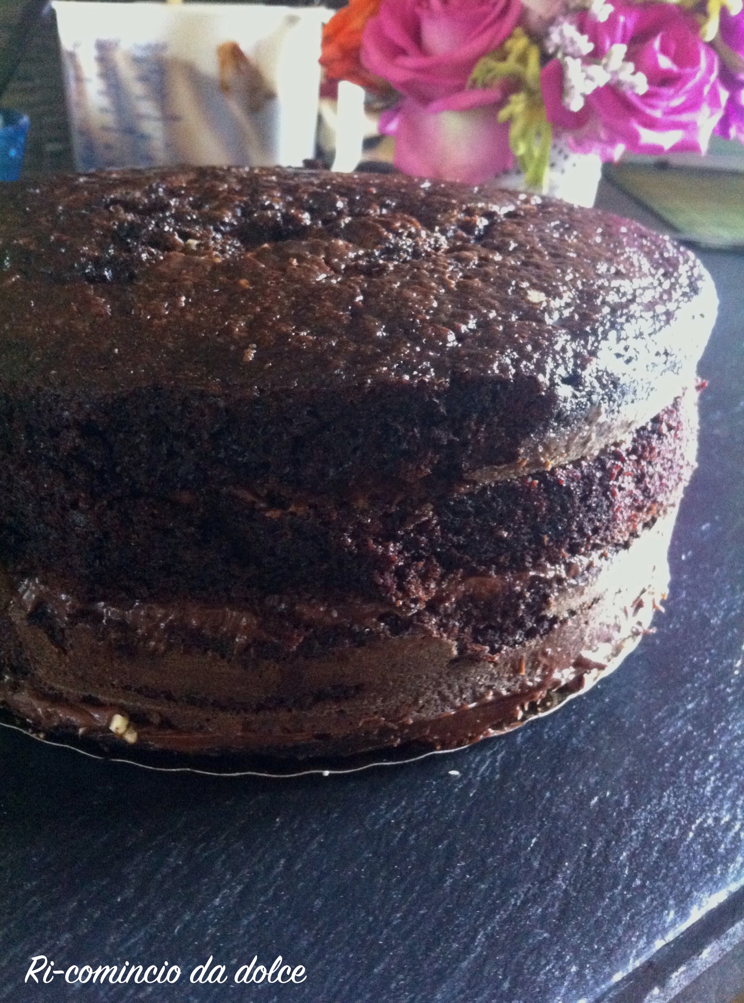 Intanto, mescola insieme tutti gli ingredienti secchi, farina, bicarbonato, lievito e sale.  Prendi il composto di cioccolato e versalo sulle uova montate con lo zucchero, mescola e aggiungi poco per volta anche gli ingredienti secchi precedentemente miscelati, quando tutti gli ingredienti saranno ben amalgamati, versa l’impasto in due stampi di uguale dimensione e cuoci in forno preriscaldato a 180°C per 35 min circa ( i tempi di cottura dipendono sempre dal forno quindi fate la prova stecchino per verificare la cottura).La ricetta originale non prevede alcuna bagna per la torta io preferisco sempre bagnarle un po’… in questo caso ho usato una semplice bagna con latte, zucchero, acqua e se vi piace potete aggiungere un goccio di liquore o di essenza alla vaniglia.
