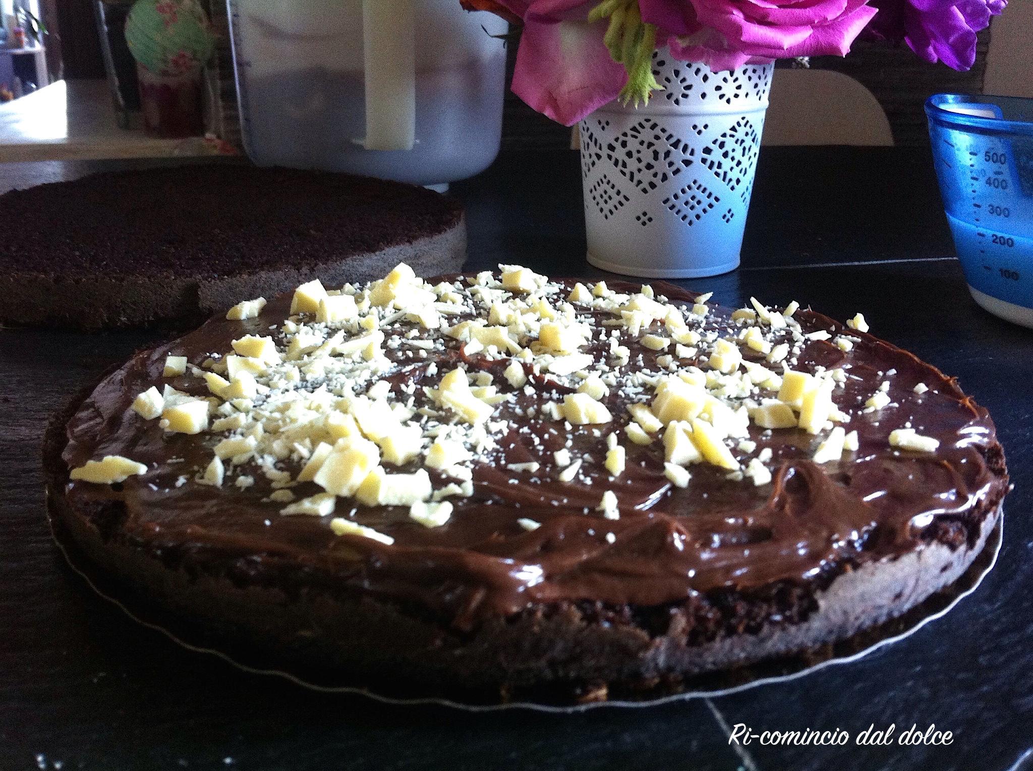 Terminata la cottura lasciate raffreddare bene le due torte e toglietele dagli stampi. Quando è completamente fredda tagliate ognuna delle due basi a metà, otterrete così quattro dischi. Posizionate la base della torta su un vassoio dello stesso diametro della torta (io ho usato dei vassoietti di carta) e bagnate il disco di pasta e stendete il frosting al cioccolato, io ho aggiunto anche del cioccolato bianco a scaglie per dare croccantezza al ripieno (se preferite potete lasciarla liscia o aggiungere qualsiasi cosa vogliate nocciole, frutta, biscotti sbriciolati ecc).