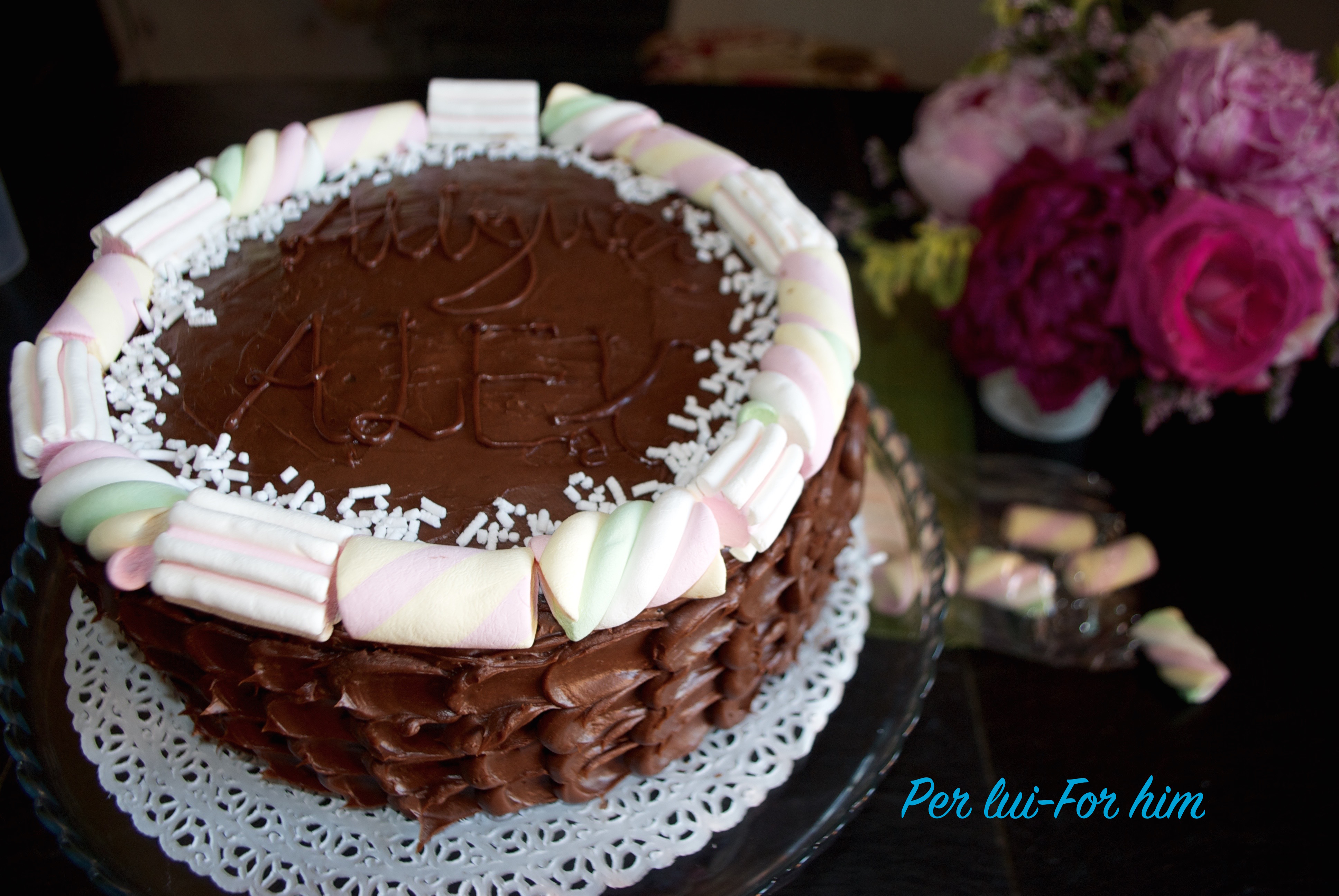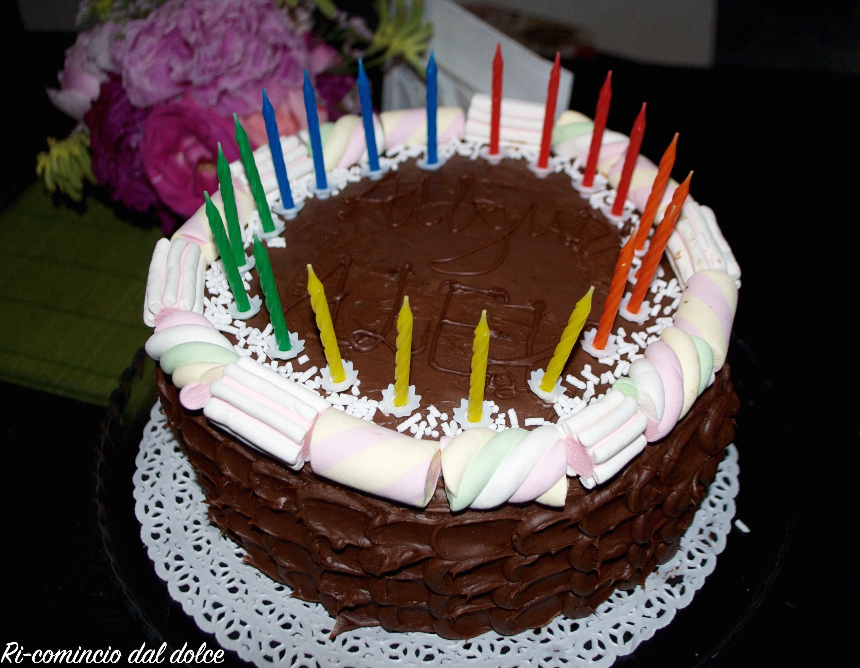 Eccola qui… finalmente anche voi a casa potrete fare questa cioccolatosa torta di compleanno!!! farla è più semplice di quanto si possa pensare quindi non fatevi spaventare dall’apparenza hihihi … mi sono imbattuta in questa ricetta per caso, mentre facevo le mie solite ricerche on-line, sono rimasta colpita dalla pagina web di una ragazza brasiliana che ha un modo molto simpatico, allegro e super colorato di presentare le sue ricette (il sito se volete dare un’occhiata è http://www.delightdulce.com). L’unica difficoltà che ho avuto riguarda l’interpretazione della ricetta, che per fortuna  è scritta in inglese, ma le unità di misura degli ingredienti non sono in grammi, quindi ho dovuto fare delle conversioni a volte un po’ approssimative. So che in commercio ci sono appositi misurini americani, ma non avevo voglia di comprare altre caccavelle, a cui poi dover trovare un posto nei miei già strapieni cassetti e mobiletti … quindi ho optato per la conversione in grammi e come vedete è perfettamente riuscita hihihi 🙂 !!!!