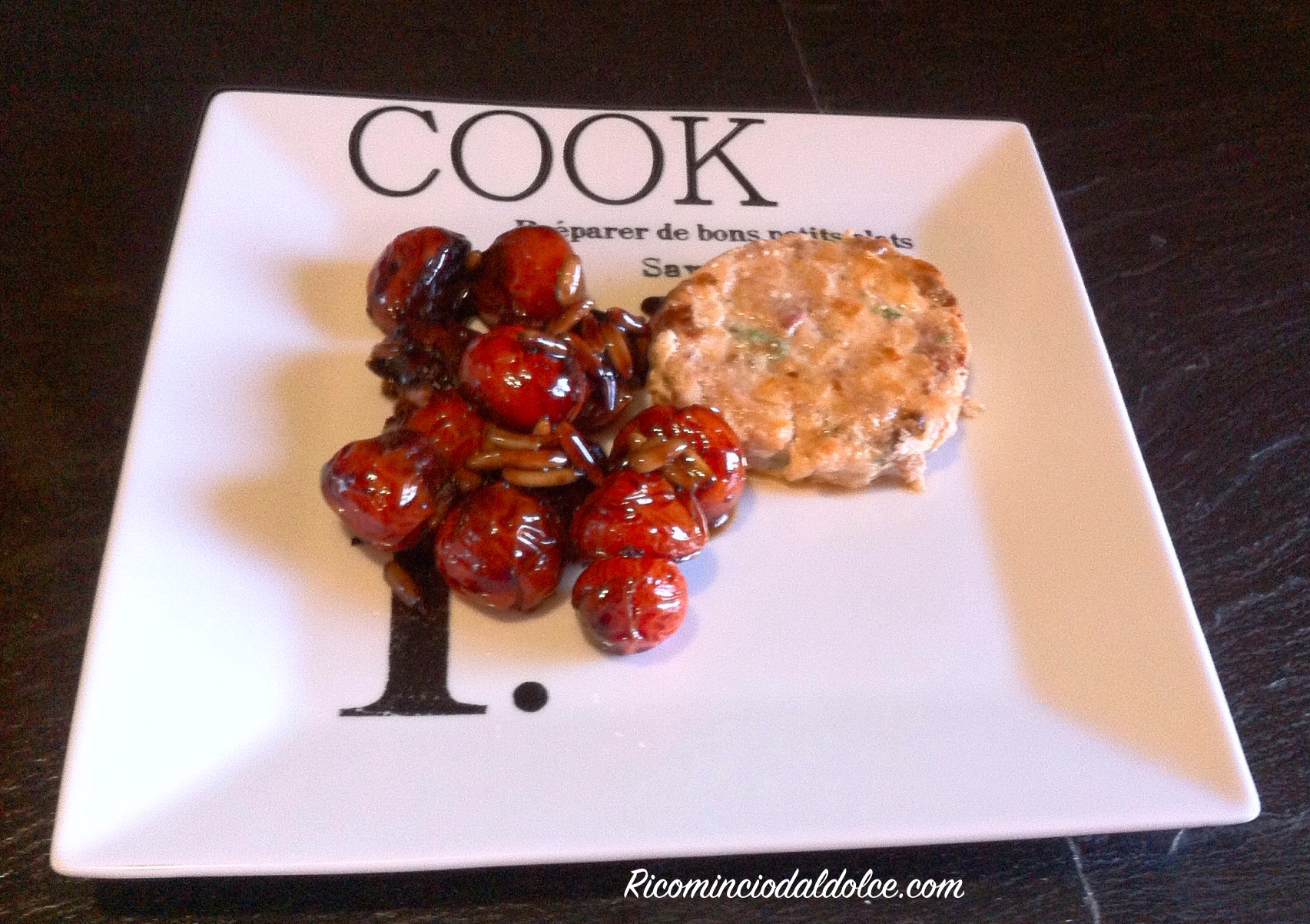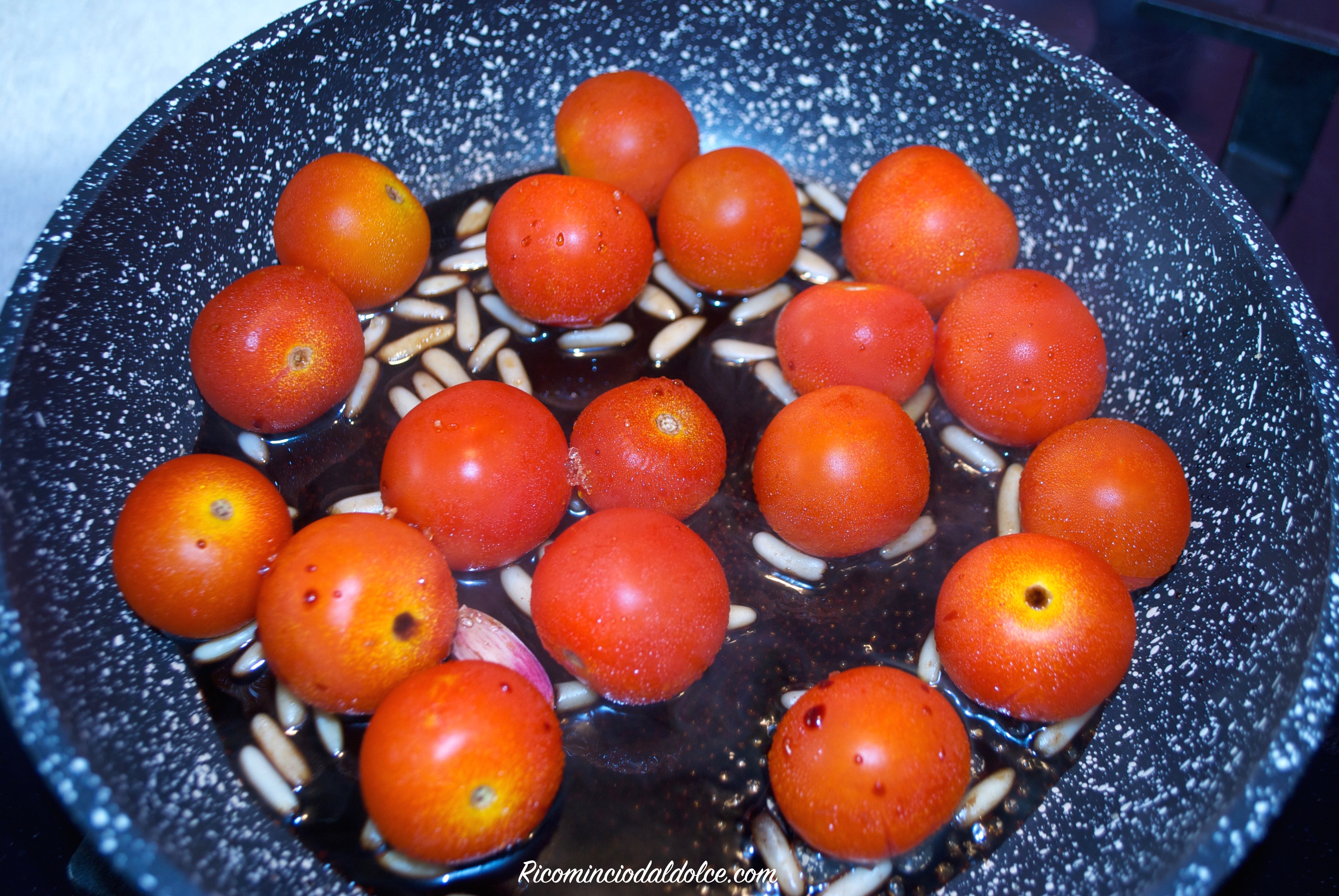 Ora siete pronti per cuocerli in padella con un filo d’olio finché i due lati non risulteranno dorati. Per il contorno a base di pomodorini caramellati basta mettere in una padella i pomodorini, l’aceto, lo zucchero, l’aglio e i pinoli, e lasciar cuocere a fuoco lento finché i pomodorini non si saranno appassiti e l’aceto caramellato e ridotto.
