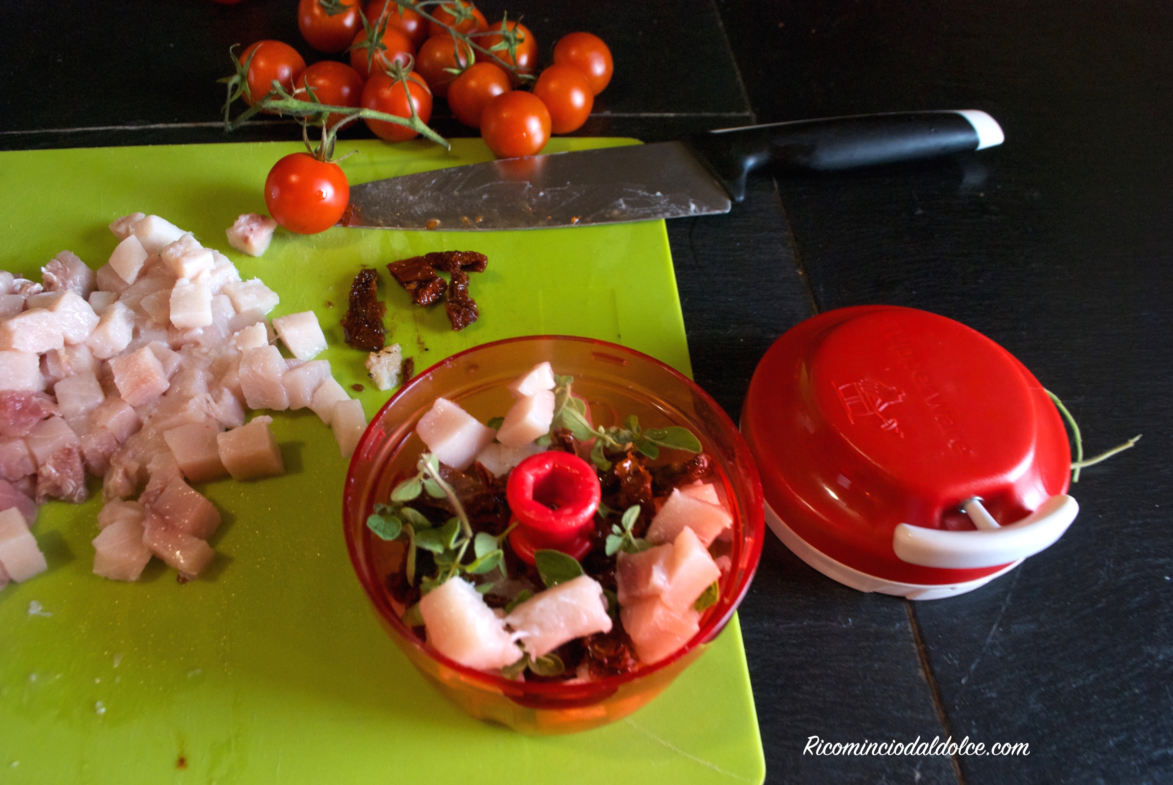 Sciacqua e priva della pelle il pesce spada, poi taglialo a dadini con il coltello. Scola i pomodori secchi, facendo colare l’olio in eccesso, e tagliali a listerelle sottili, dopo di che inserisci i cubetti di spada, i pomdori secchi e l’origano in un mixer da cucina e dai una leggera frullata per ammalgamare tutti gli ingredienti.