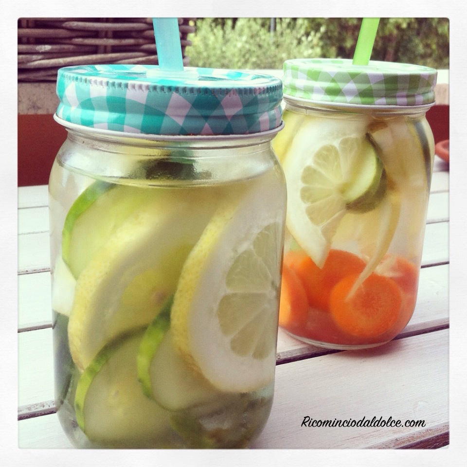 Contro il caldo e l’arsura delle lunghe giornate estive, non c’è niente di più dissetante dell’acqua. Nelle ore più calde della giornata è importante rimanere idratati e soprattutto farlo nel modo giusto, ossia evitando alcolici e bibite gasate .. per alcuni il detto è facile come bere un bicchier d’acqua non corrisponde proprio alla verità, soprattutto quando gli esperti consigliano di bere almeno 2 litri di acqua al giorno, la maggior parte di noi infatti fatica a raggiungere tale obiettivo. Ma non disperate con le acque detox o le meglio note acque aromatizzate, bere l’acqua sarà ancora più piacevole. Semplicemente si tratta di acqua fredda all’interno della quale si lascia in infusione per almeno 4/6 ore, qualsiasi tipo di frutta o verdura di stagione, che in questo modo trasferisce nell’acqua parte delle proprie proprietà nutritive, aiutando il nostro organismo in certi casi a purificarsi, ad aumentare le difese immunitarie o addirittura a dimagrire; oltre ad insaporire l’acqua dell’aroma che più ci piace. Le combinazioni possibili sono innumerevoli, quindi gli ingredienti che si scelgono possono essere dettati semplicemente dal gusto personale o dalla volontà di raggiungere un determinato risultato (purificarsi, ridurre la ritenzione idrica, migliorare la digestione e chi più ne ha più ne metta). Ne Esistono anche in commercio, ma non hanno nulla e che vedere con quelle preparate a casa prive di zuccheri aggiunti, coloranti e aromi artificiali e con zero calorie.