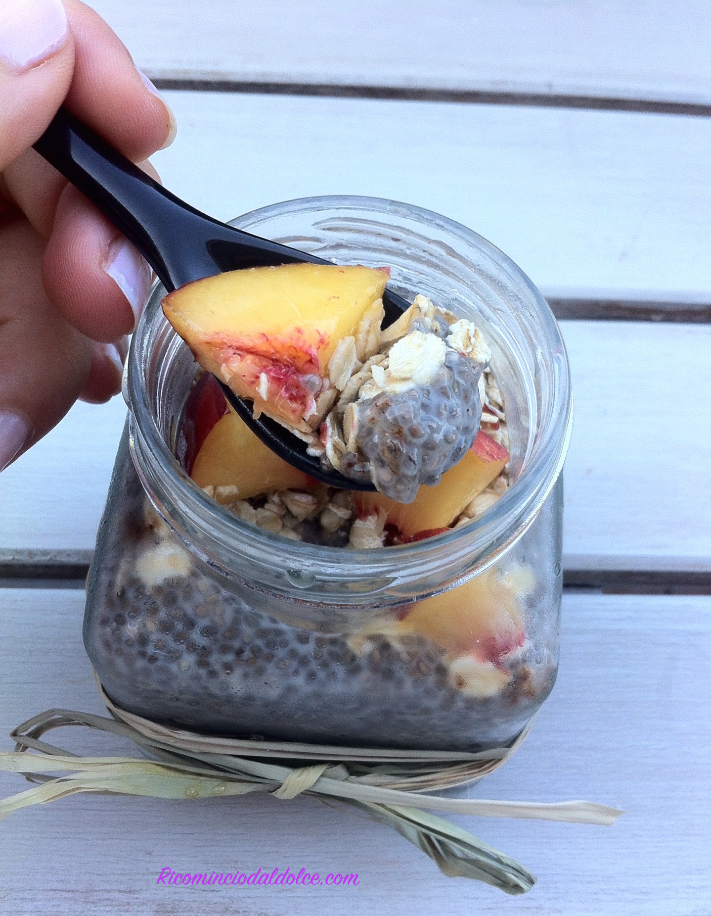 Per preparare il budino potete usare un bicchiere di vetro o dei barattoli di vetro (in questo modo potete riciclare quelli delle confetture ;)). Versate poco alla volta, alternandoli, il latte vegetale che avete scelto e i semi di Chia. Essendo i semi molto piccoli e leggeri tenderanno a risalire in superficie, quindi mescolate bene e più volte con un cucchiaio, per distribuirli nel latte in modo omogeneo. Se volete potete aggiungere un cucchiaio di miele e un pizzico di cannella o vaniglia. Coprite il bicchiere o il barattolo e lasciate riposare il composto in frigo per un paio d’ore o per tutta la notte.