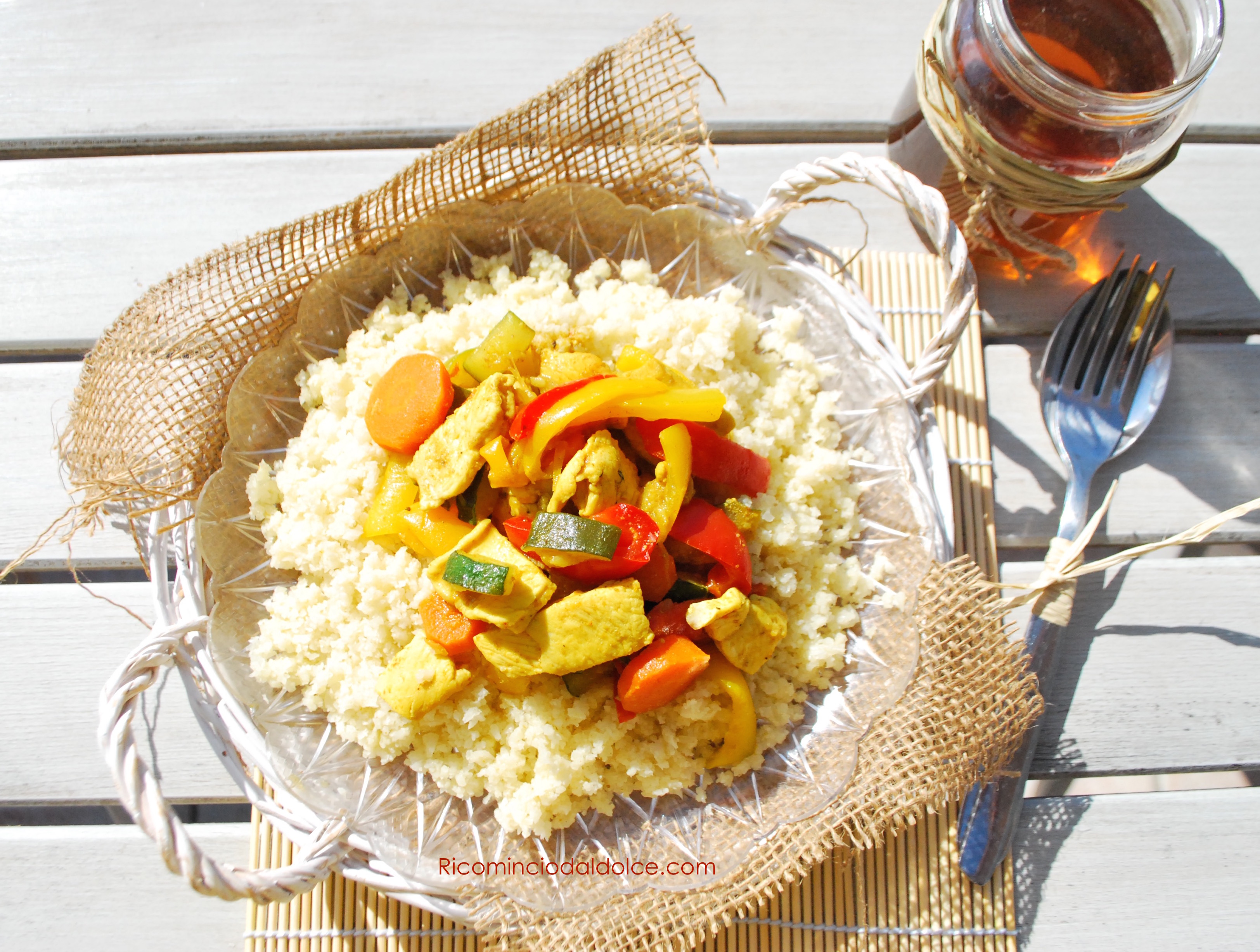 Distribuisci il “Cous Cous di cavolfiore” su i piatti e aggiungi in cima il pollo con le verdure.