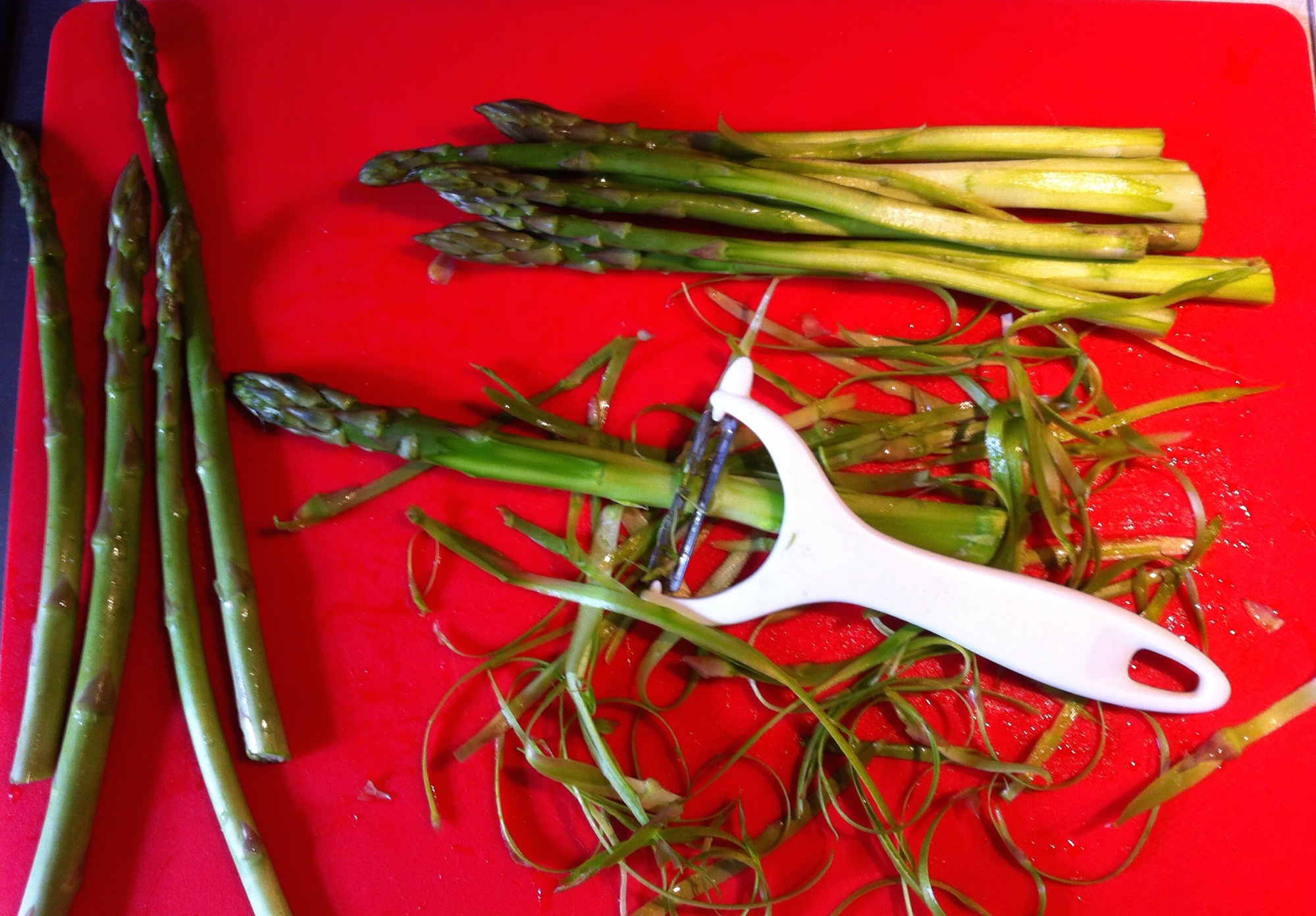 Per prima cosa lavate gli asparagi e privateli della parte finale più legnosa, che io ho usato per fare il brodo, altrimenti potete usare del brodo già pronto. Con un pela cartone pelate gli asparagi per privarli dello strato più duro, senza intaccare le cime.