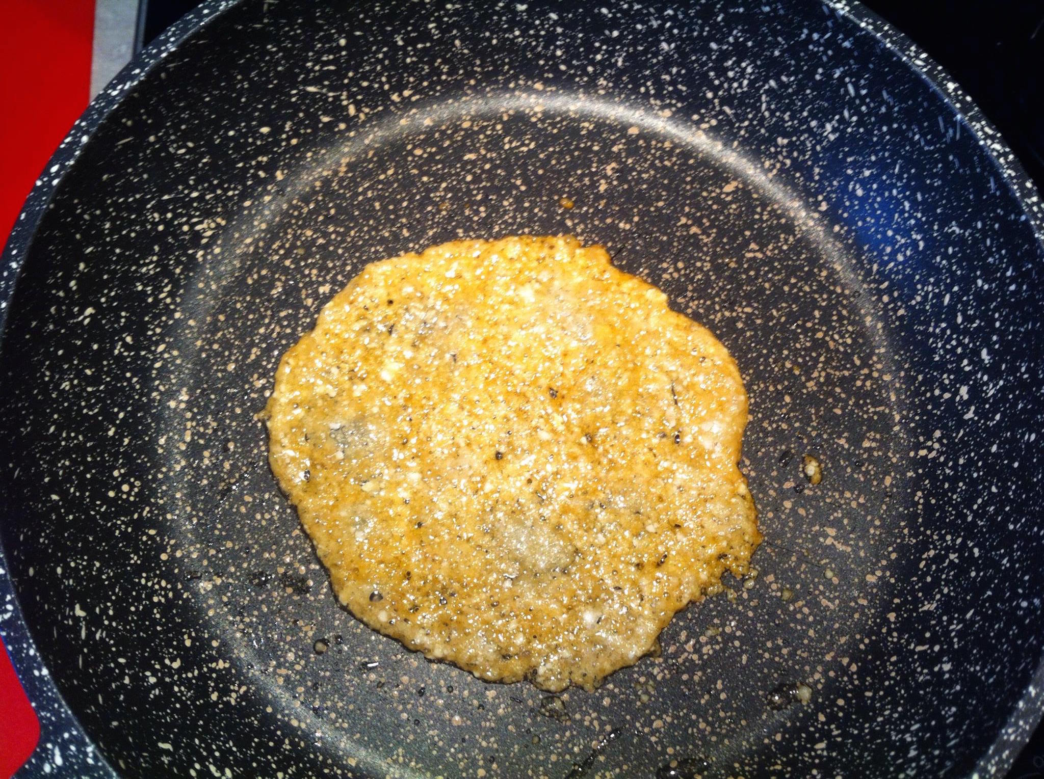 Se volete preparare anche la cialda di Parmigiano, realizzarla è molto semplice. Potete cuocerla in forno (su carta forno), o se avete una buona padella antiaderente usare quella come ho fatto io. Prendete circa due cucchiai di Parmigiano e disponeteli sulla padella a formare un cerchio, appiattite bene la superficie, accendete la fiamma a fuoco dolce e lasciate cuocere finché, anche il lato superiore non assume una colorazione dorata, spegnete il fuoco e con delicatezze trasferite la cialda su di una superficie per farla raffreddare.