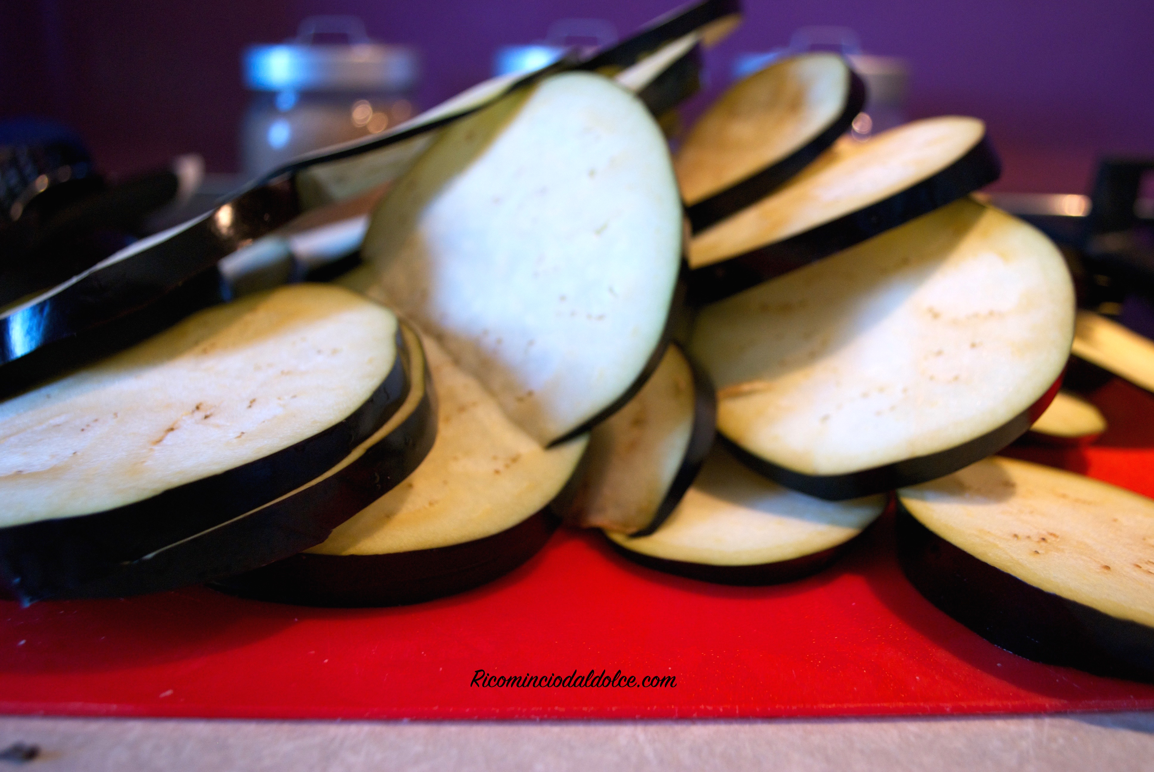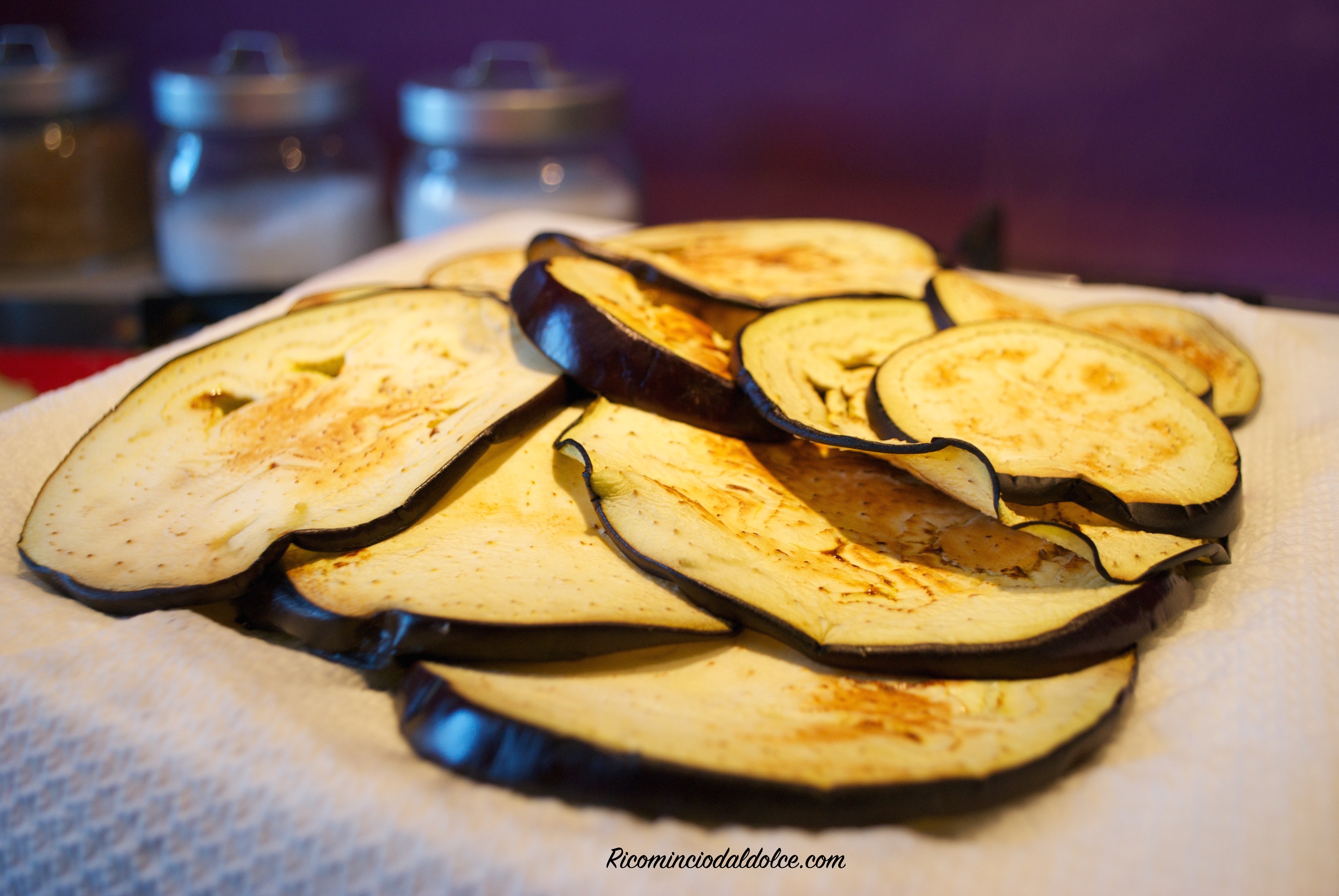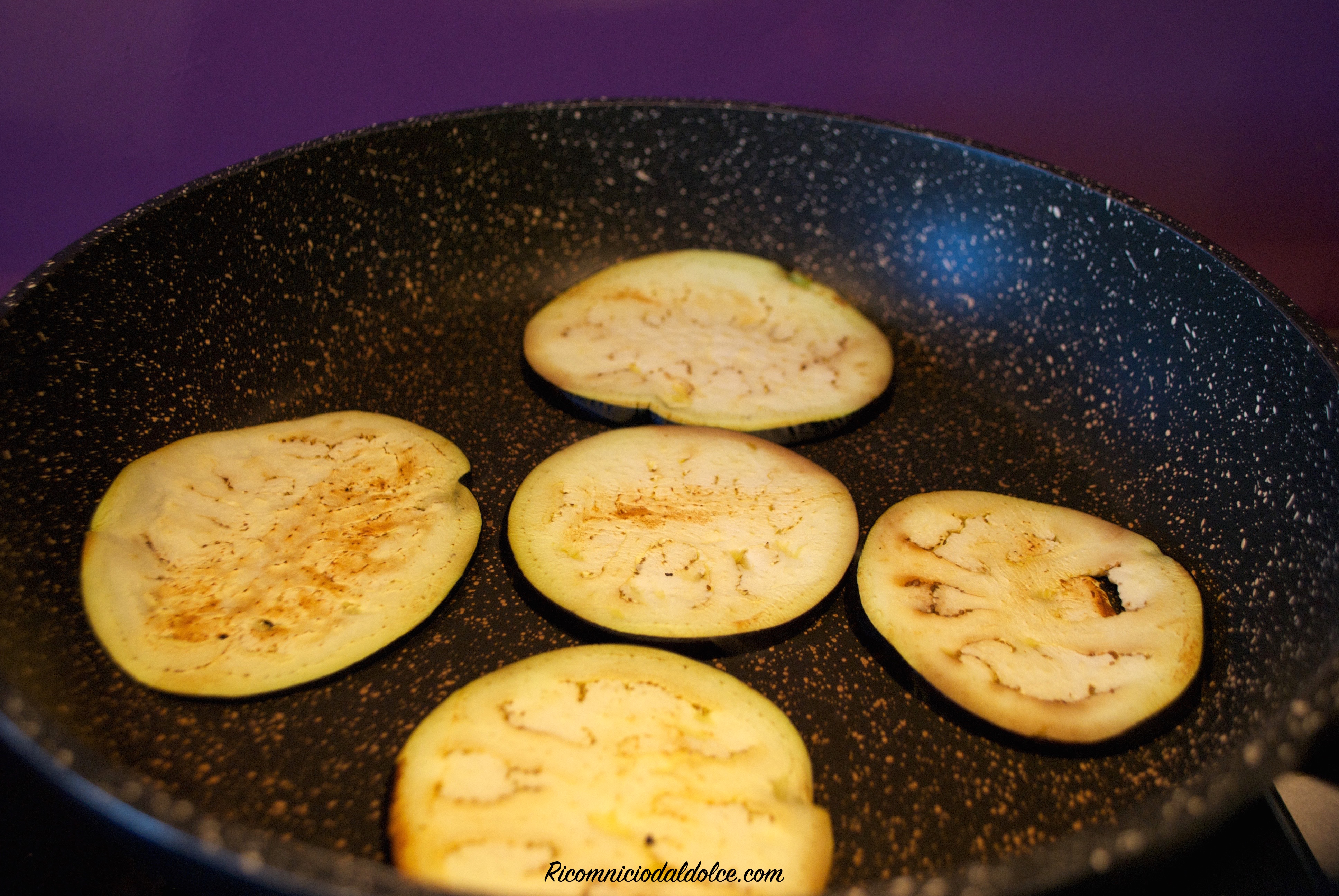 Per preparare la versione leggera della Parmigiana, naturalmente, invece di friggere le melanzane le cuoceremo alla piastra o in padella antiaderente. Quindi per prima cosa lava e taglia le melanzane, disponi le fette su una piastra o se non ne possiedi una, fai come me, e cuocile in una padella antiaderente finché non perdono parte della loro acqua,e girale per uniformare la cottura su entrambi i lati.