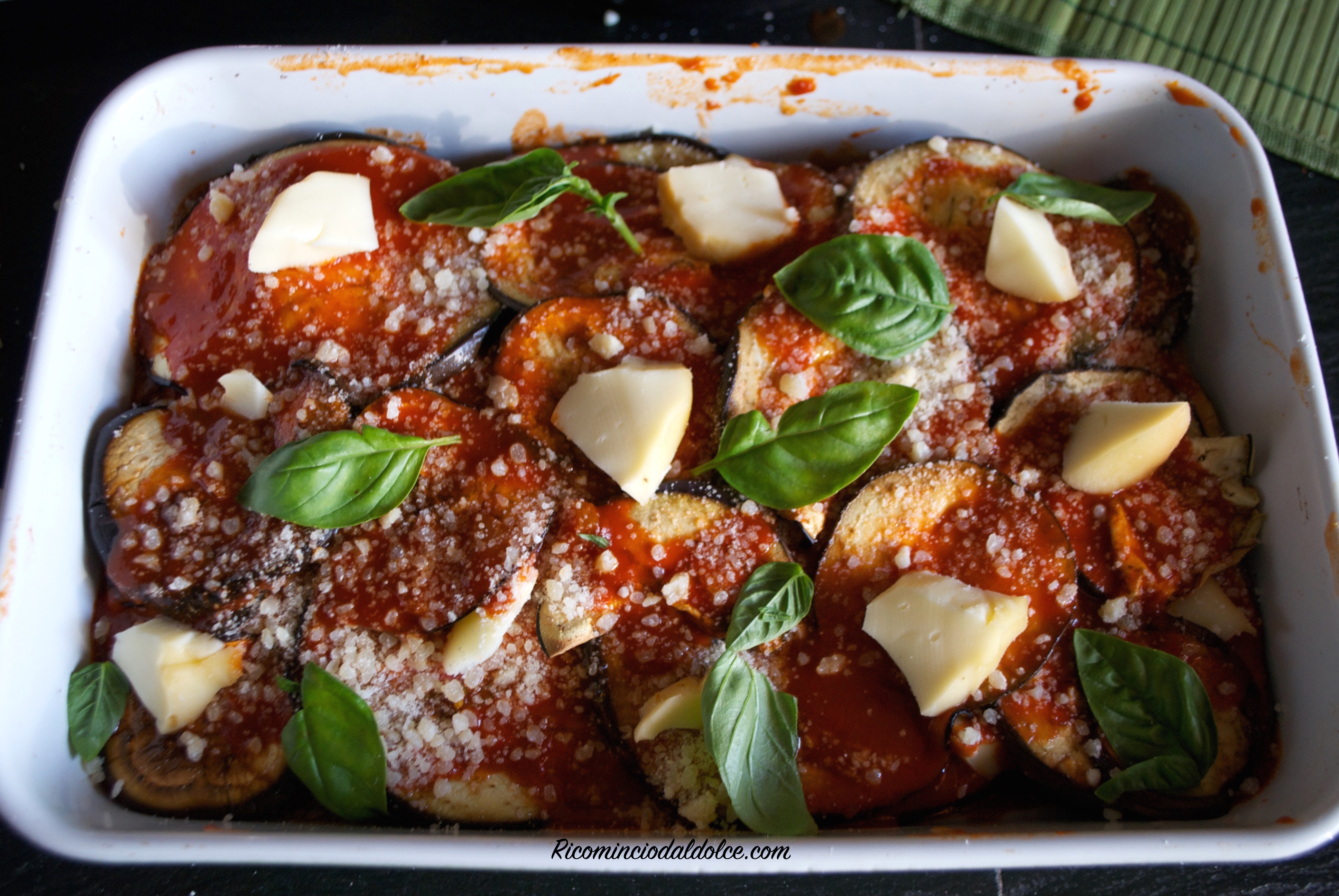 Ungi con un po’ di olio una teglia alta da forno, e inizia disponendo un primo strato di melanzane, ricompri con il pomodoro, una spolverata di parmigiano, la scamorza e qualche fogliolina di basilico fresco.